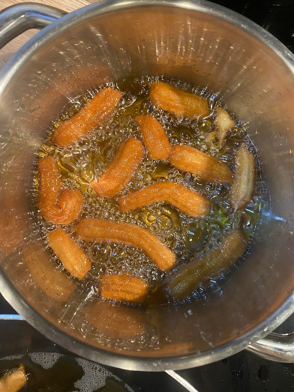 10. Remove with a slotted spoon and place on kitchen roll to drain excess oil, and roll in cinnamon sugar while still warm.